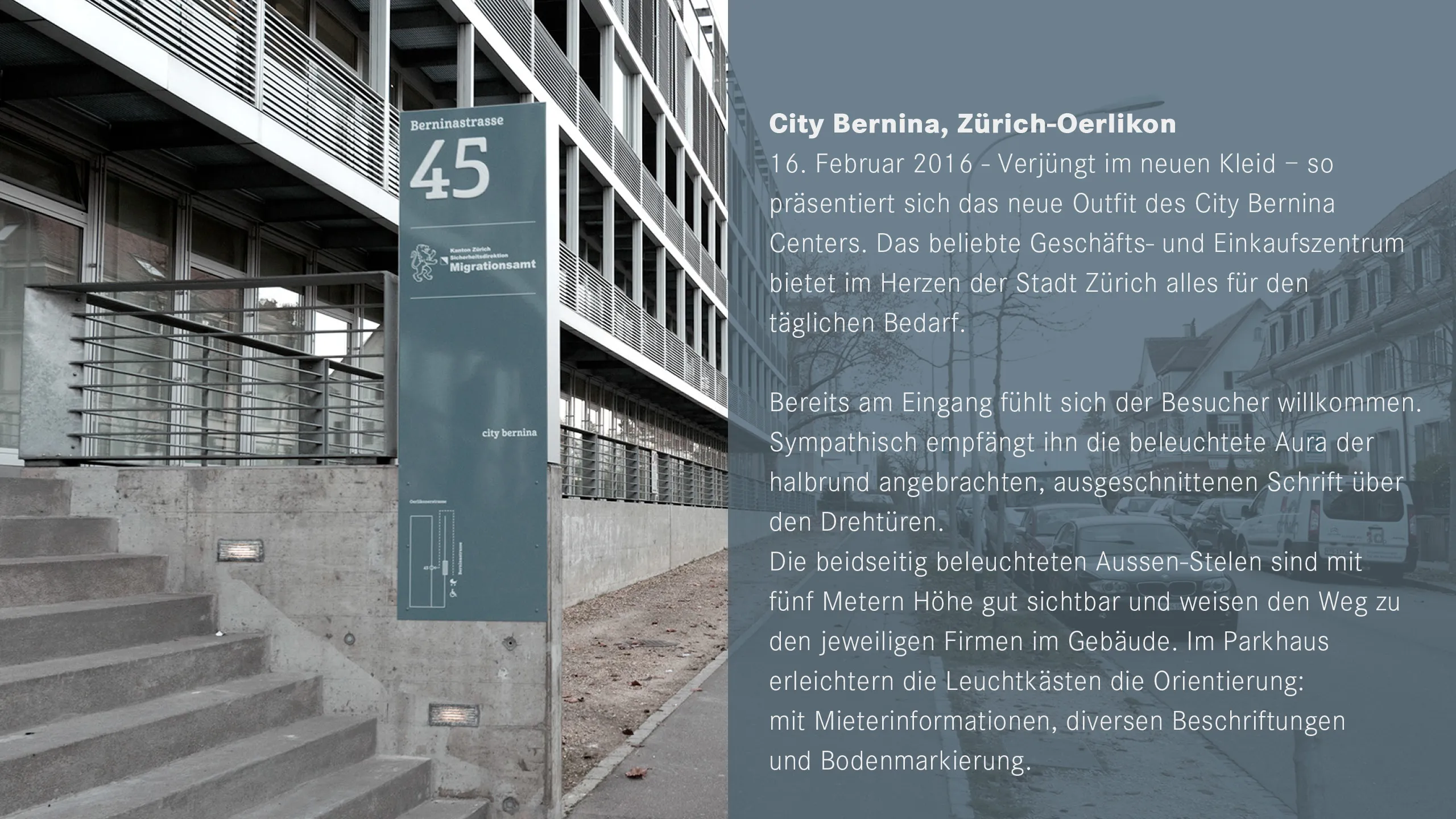 City BertninaJunges Outfit durch Signaletik City BertninaJunges Outfit durch Signaletik City BertninaJunges Outfit durch Signaletik Weitere Projekte KKL Kultur- und Kongresszentrum Luzern Schriftzug als Deko für die Fassade Letzipark Signaletik für das Einkaufszentrum Main Tower Signaletik aarReha Rehabilitation und Signalisation City Bernina Junges Outfit durch Signaletik KSW Kantonsspital Winterthur Signaletik, die Vertrauen schafft Claraspital Signaletik UNESCO Bahnerlebnisweg Albula Mit Signaletik unterwegs durch Zeit und Natur Dino Center Signaletik für das Einkaufszentrum