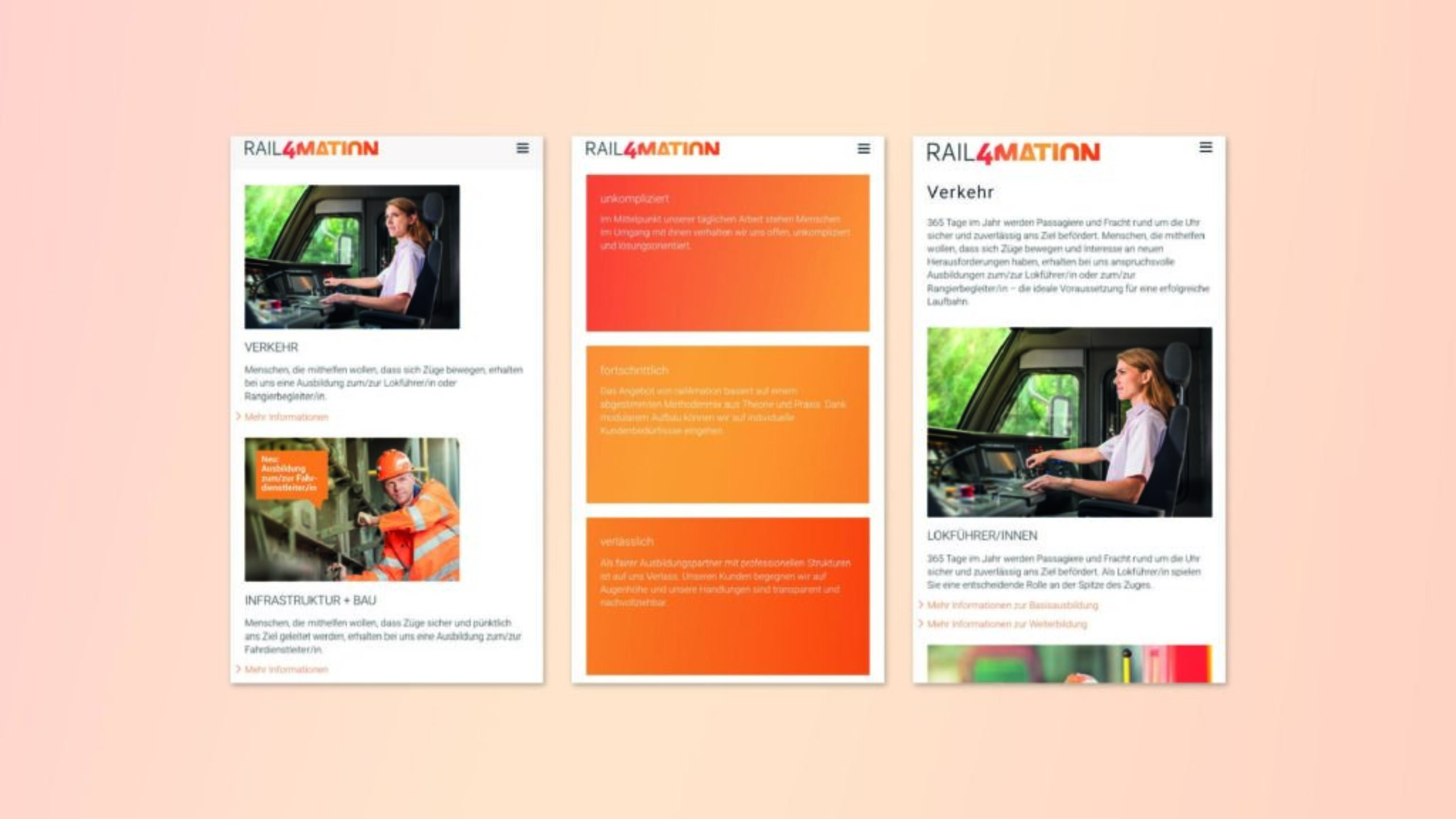Rail4mationAusbildungshaus für Bahnbetriebe Rail4mationAusbildungshaus für Bahnbetriebe Rail4mationAusbildungshaus für Bahnbetriebe Weitere Projekte Jonapark Rüti Wohnraum digital entdecken und Zuhause finden Sihltal Zürich Uetliberg Bahn SZU Online Verbindungen finden und Ticket lösen Menu and More Digitale Unternehmensvorstellung im Web Kern Uster Website für das Wohn- und Gewerbeviertel Rail4mation Webauftritt für das Bahnunternehmen Wirtschaftsschule KV Winterthur Einheitlicher Markenauftritt für die Schule